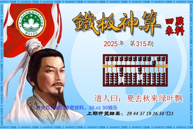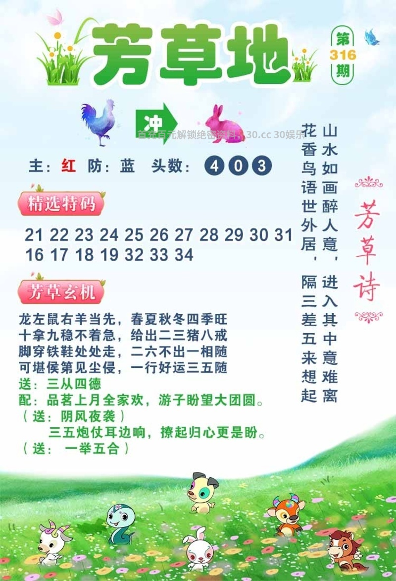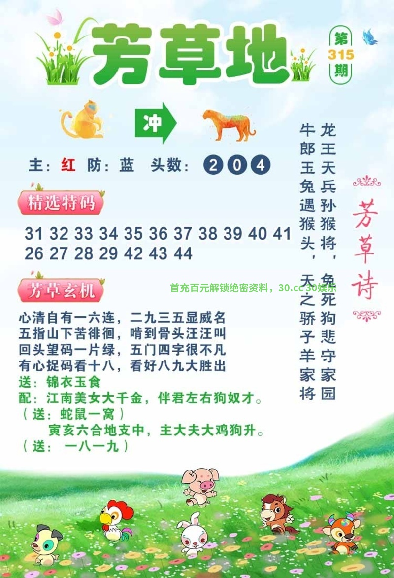 | 317期芳草玄机:龙王天兵孙猴将,兔死狗悲守家园。牛郎玉兔遇猴头,天之骄子羊家将。江南美女大千金,伴君左右狗奴才。寅亥六合地支中,主大夫大鸡狗升。 芳草诗:三零四六为正码,二八横空二点四。啸一声心惊胆跳,龙前牛后中间二。 特肖:虎鼠鸡猴龙马兔 波色:红绿 |